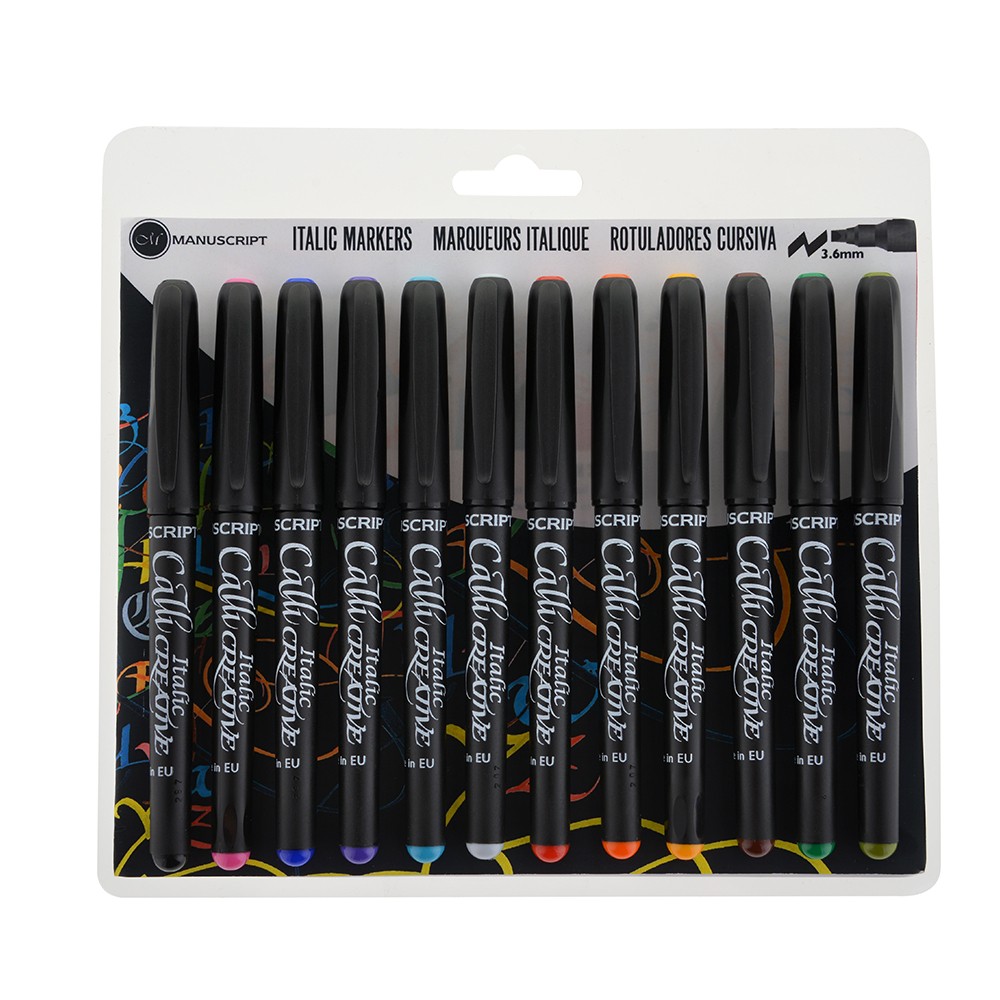 12 Callicreative Italic Markers with a 3.6mm tip - Black, Pink, Blue, Purple, Turquoise, Grey, Red, Orange, Yellow, Brown, Dark Green, Olive Green