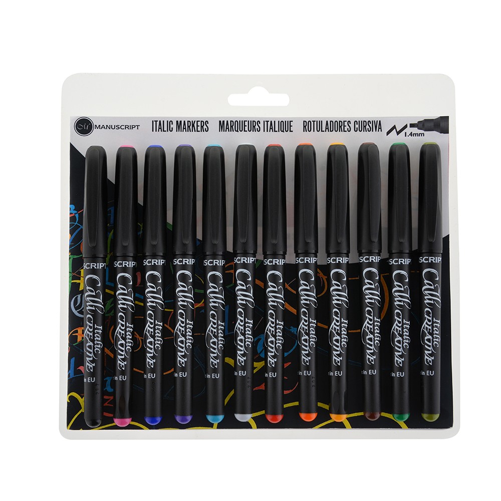 12 Callicreative Italic Markers with a 1.4mm tip - Black, Pink, Blue, Purple, Turquoise, Grey, Red, Orange, Yellow, Brown, Dark Green, Olive Green