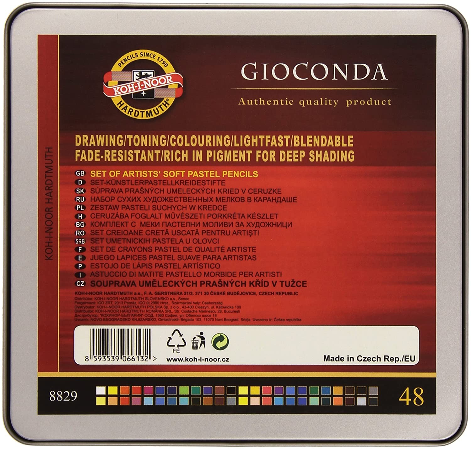 Explore your creative potential with this fantastic set of 48 Giconda soft pastel pencils by Koh-I-Noor. Create detailed coloured sketches and drawings with an extensive range of colour choice in this set. These break resistant, cored cedarwood colouring pencils are presented in a sturdy silver tin, ideal for use in all environments from studio, to home, classroom or on the go sketching. PROFESSIONAL QUALITY at an affordable price. These soft pastel pencils feature a round barrel for an easily achieved ergonomic grip and 4.2mm lead diameter, making them suitable for all different types of pastel pencil drawing.