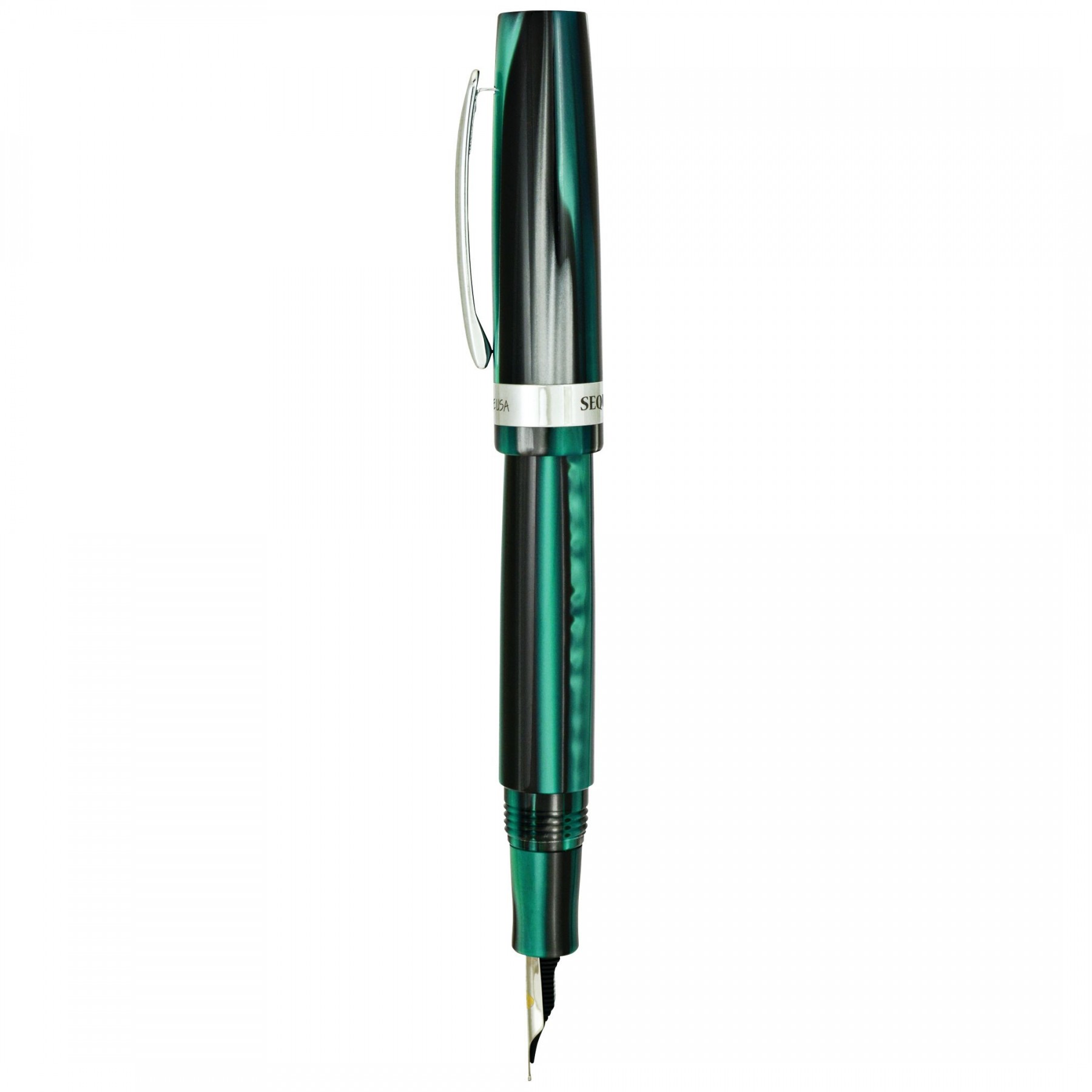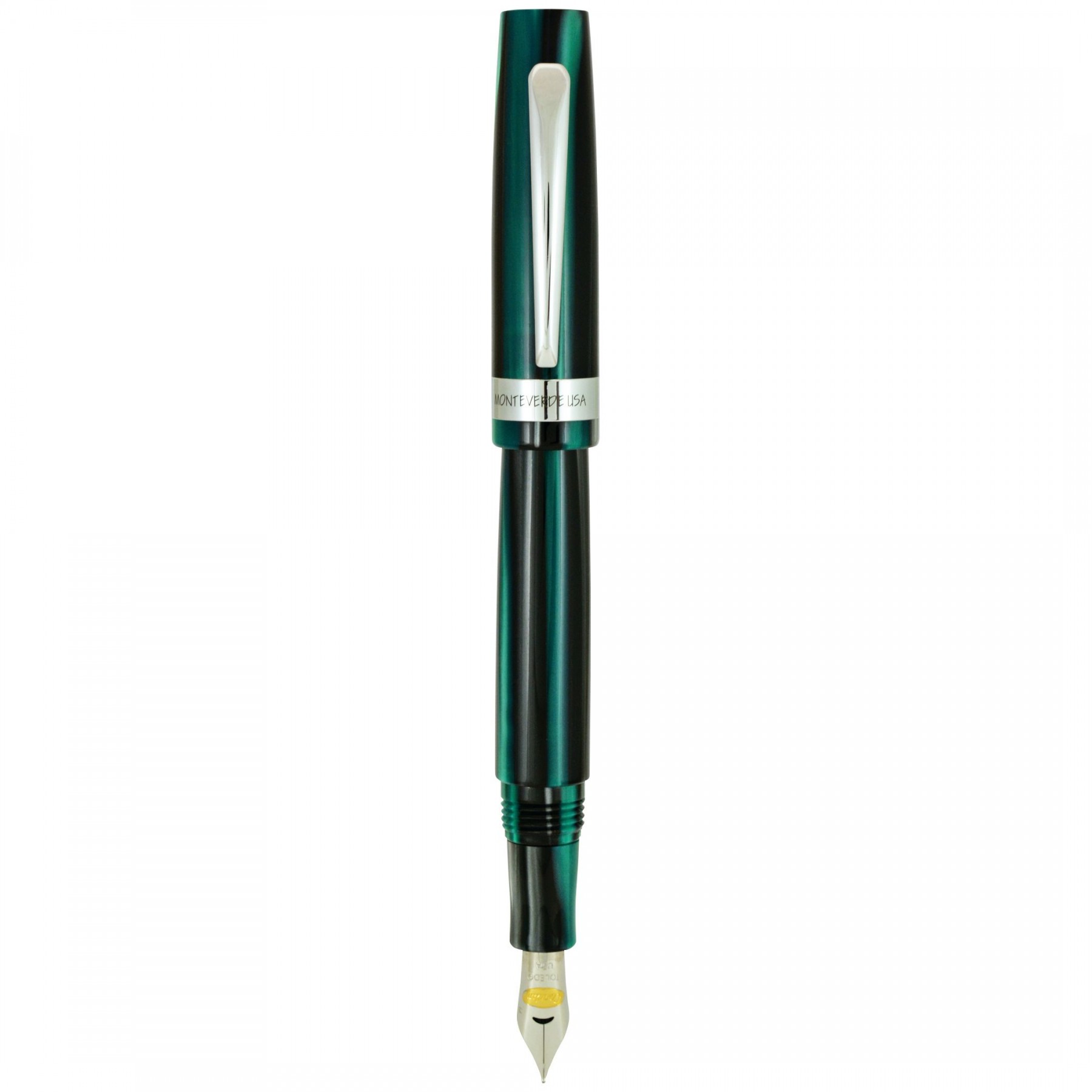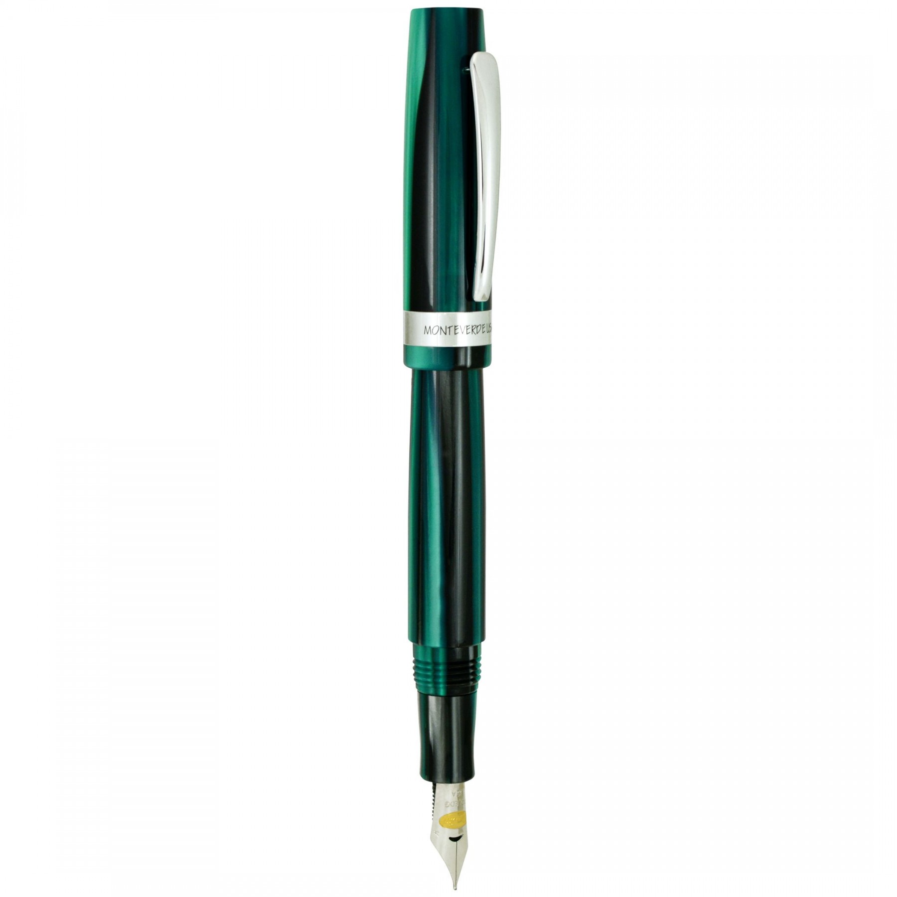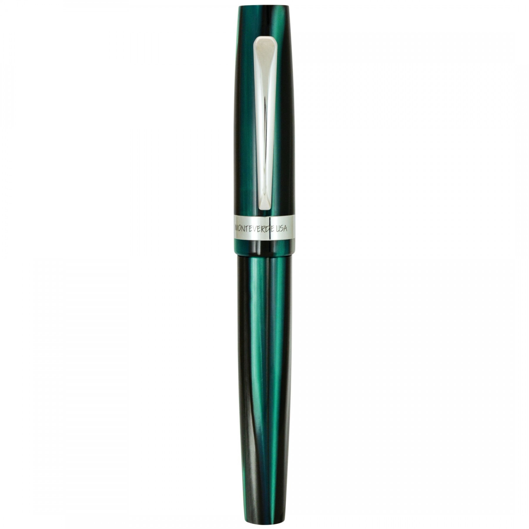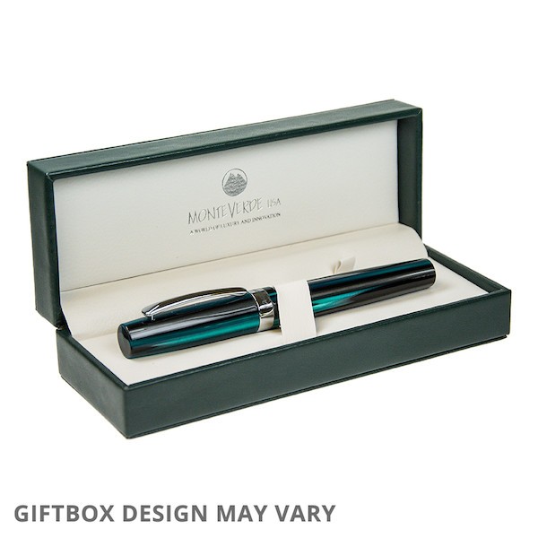 EXQUISITE GREEN CASE- Displayed in a rich green leather like case, lined with cream leather and embossed with the silver Monteverde logo. A couple of cartridges can be found beneath the pen cushion enabling a number of colour possibilities.